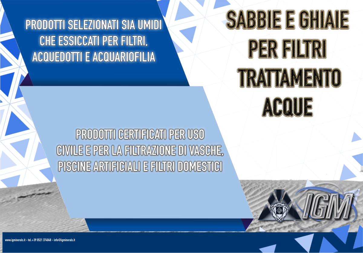 Nel campo della filtrazione acque ed acquariofilia, IGM è in grado di offrire l’intero set di granulometrie conformi alla UNI EN 12910 che consentono alla Sabbia Garnet a marchio IGM di poter essere utilizzata come materiale principale nella realizzazione di filtri multistrato per una migliore azione di sanificazione e trattamento dei liquidi.